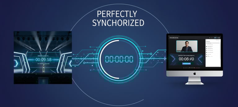 Sync timers across multiple stages or virtual rooms for coordinated transitions.